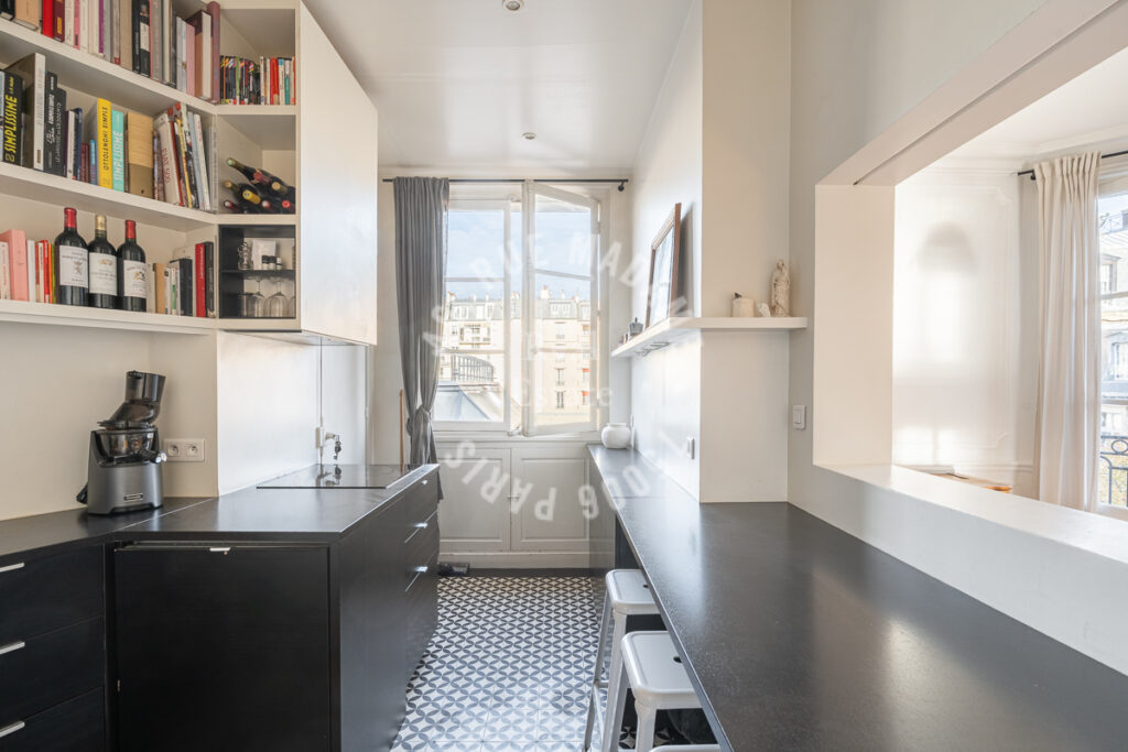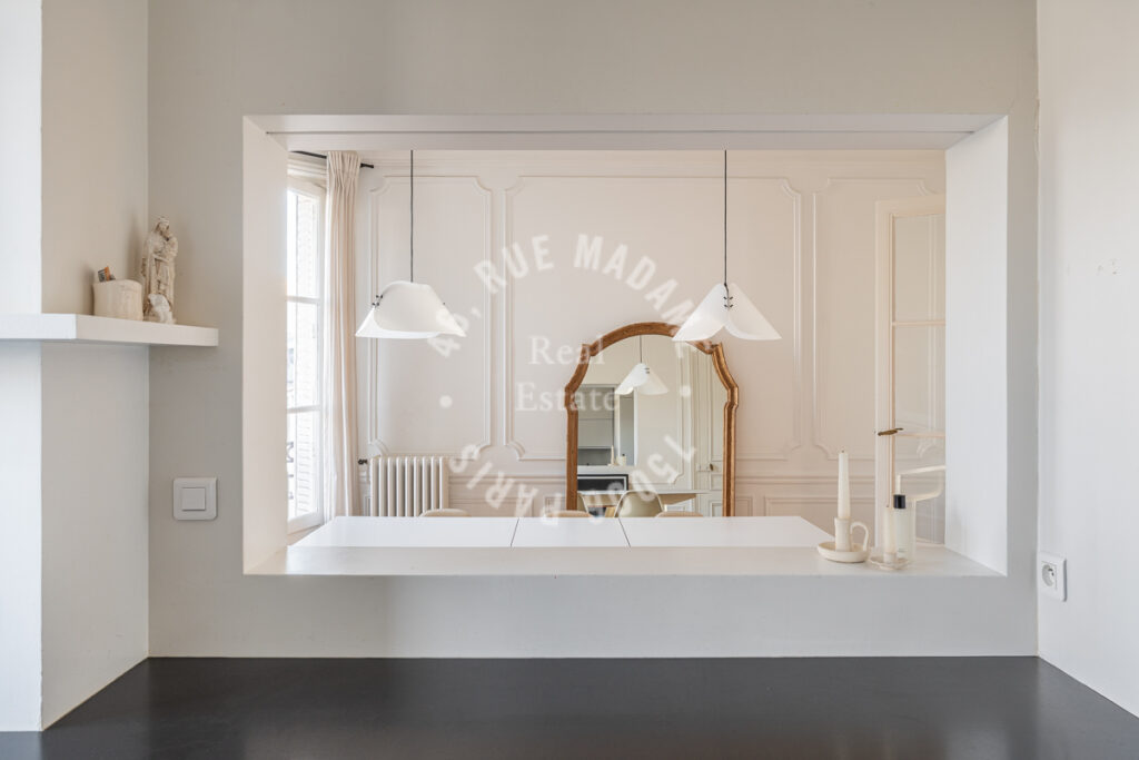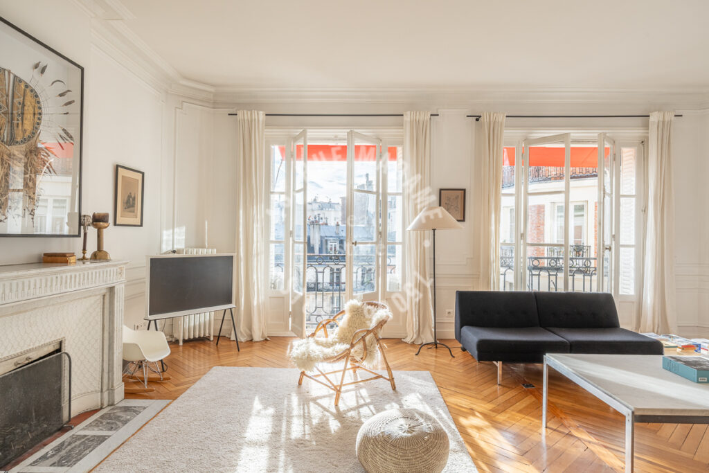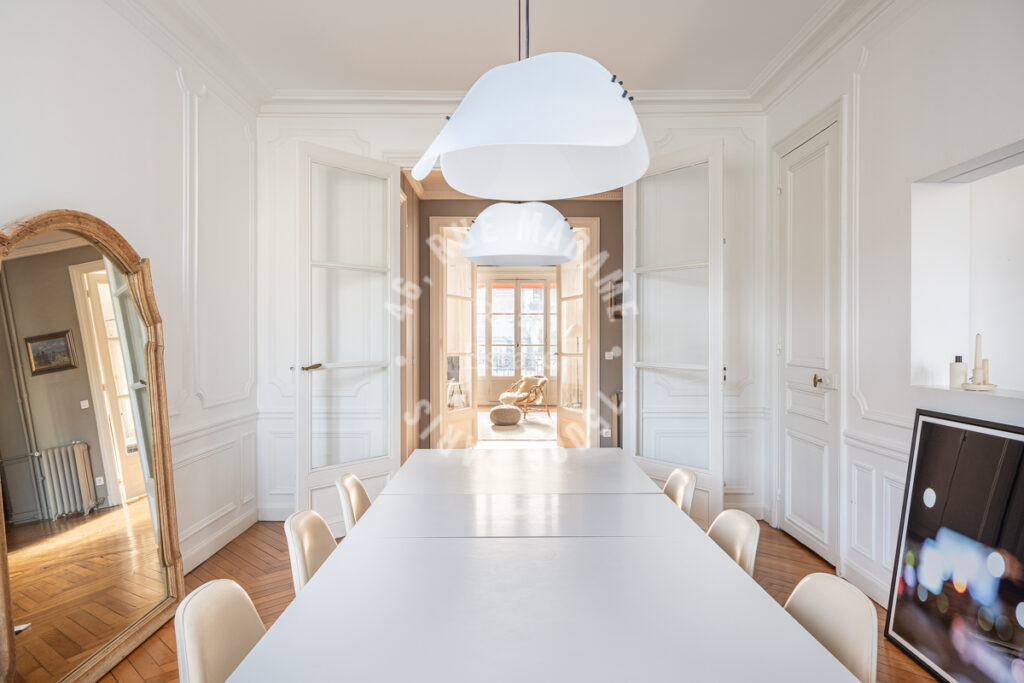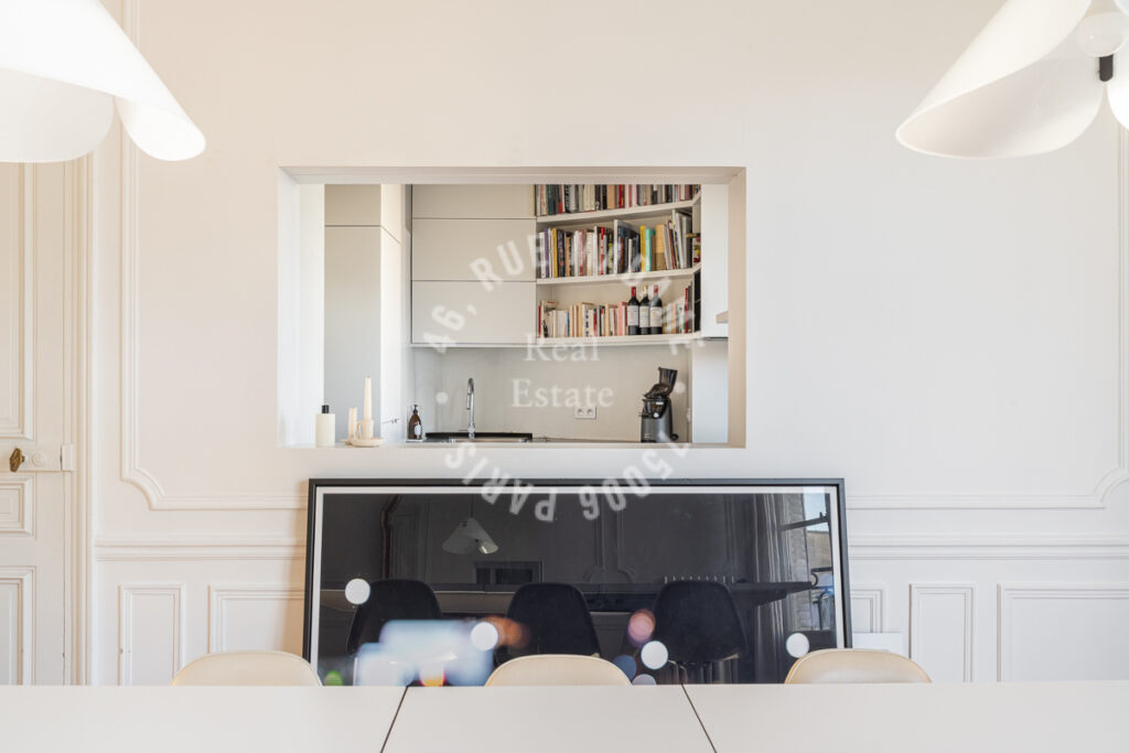 Dans une rue calme du quartier Passy, au sixième étage d’un immeuble début XXème, bel appartement inondé de lumière de 153,72 m2 comprenant une galerie d’entrée, une double réception, une salle à manger, une cuisine ouverte, quatre chambres, une salle de bain et deux salles d’eau et une chambre de service de 7 m2. Triple exposition et jolis éléments anciens conservés. Appartement en bon état. Distribution parfaite.