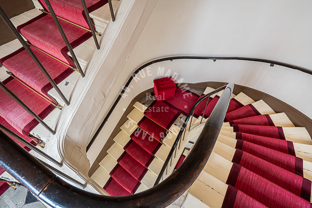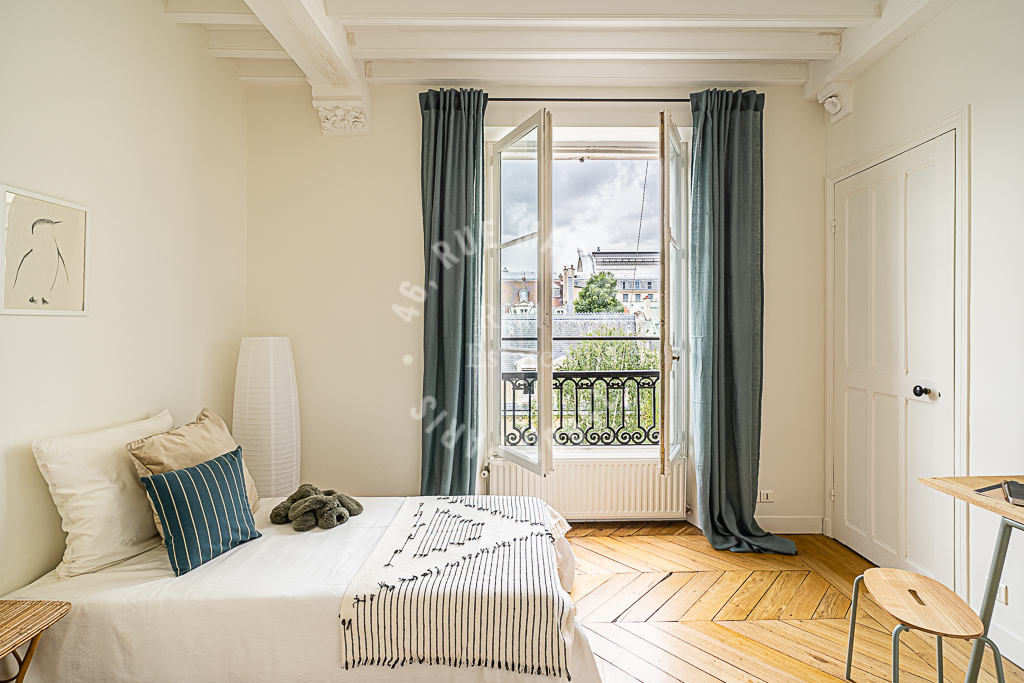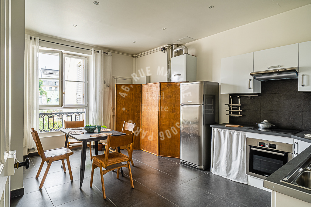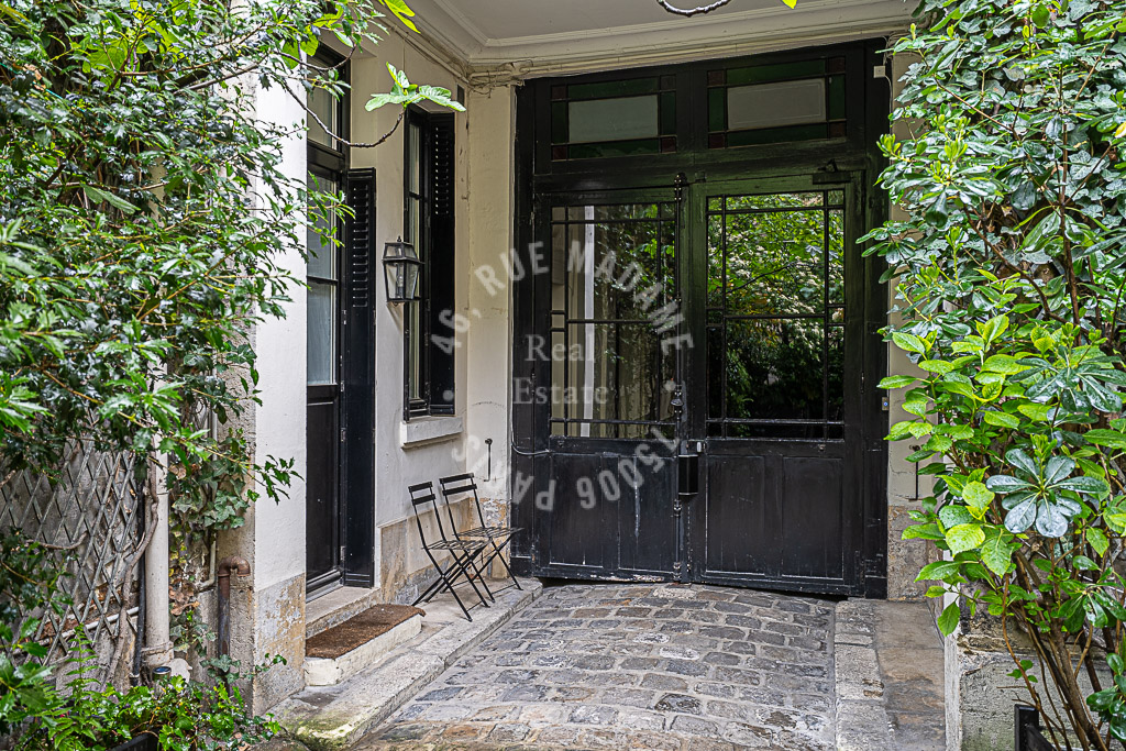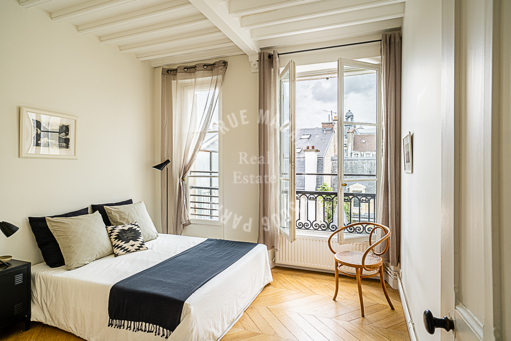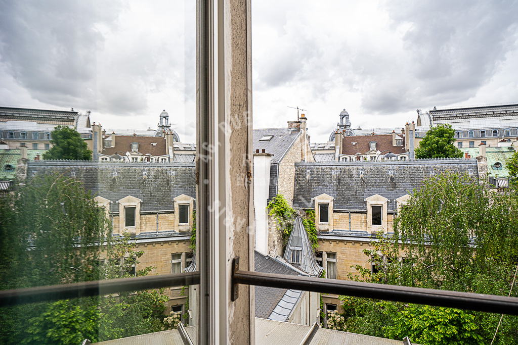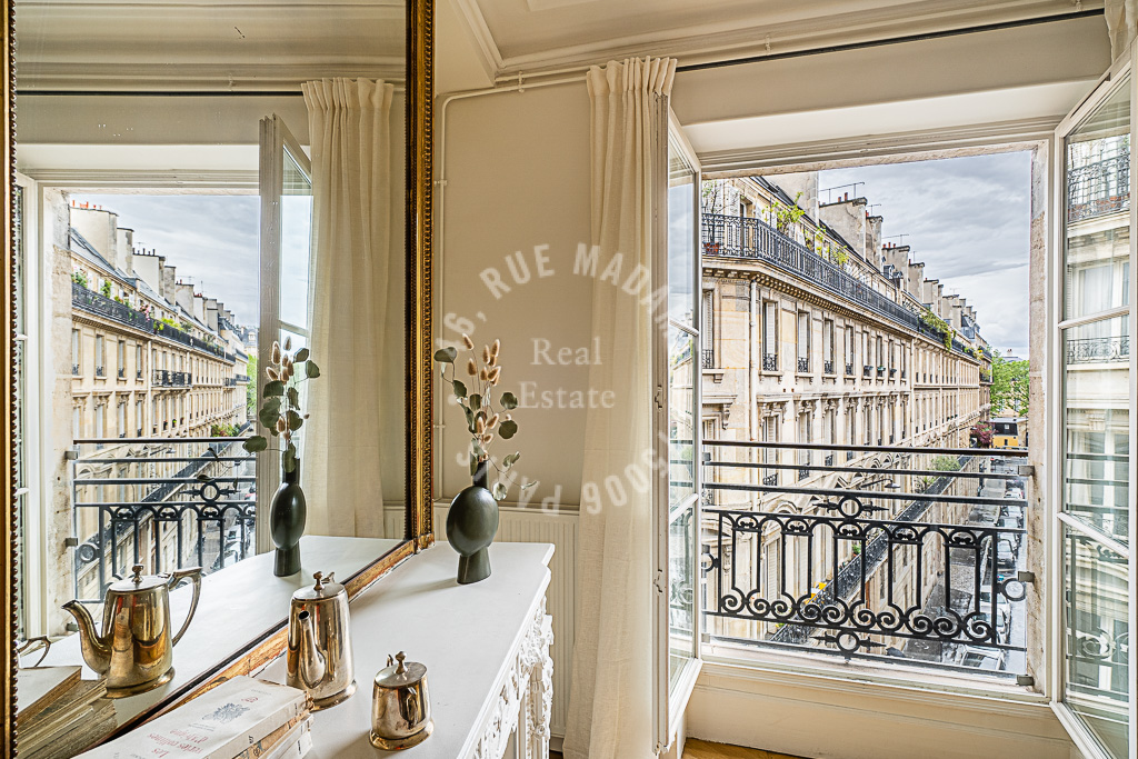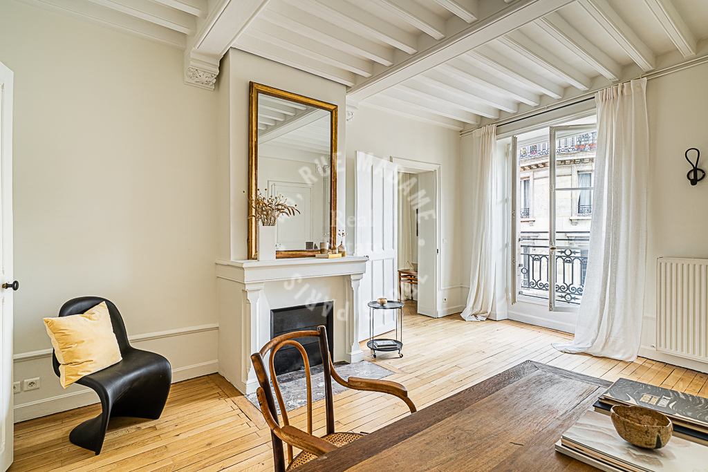 Dans un remarquable immeuble fin XVIII, élégant appartement de 93 m2 traversant. Deux chambres. Aucun vis à vis. Vues sur jardins. Plan parfait.