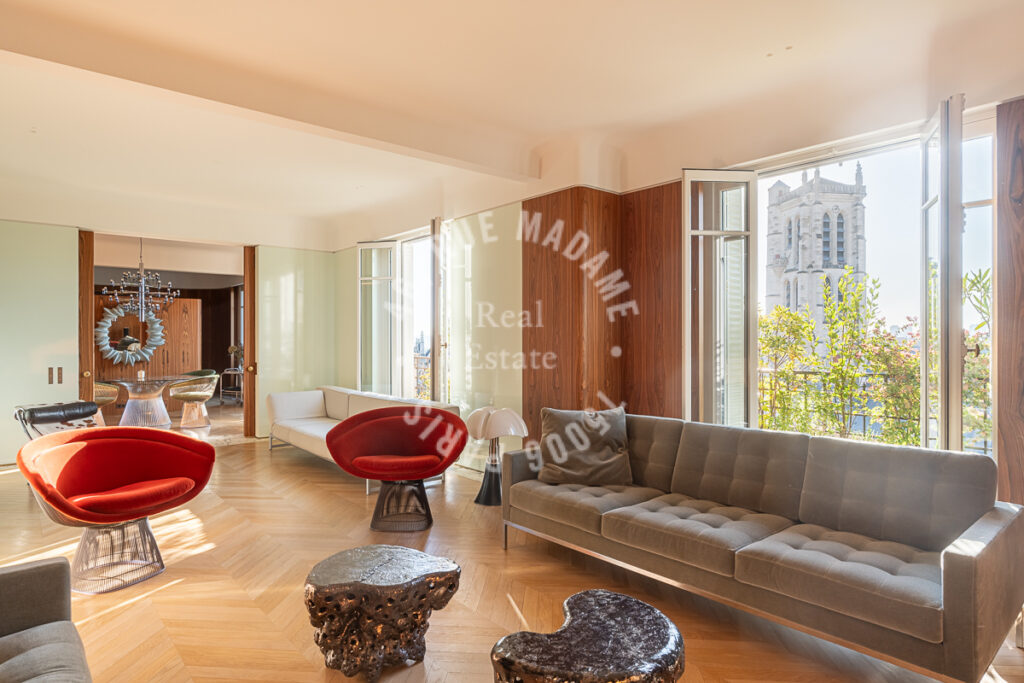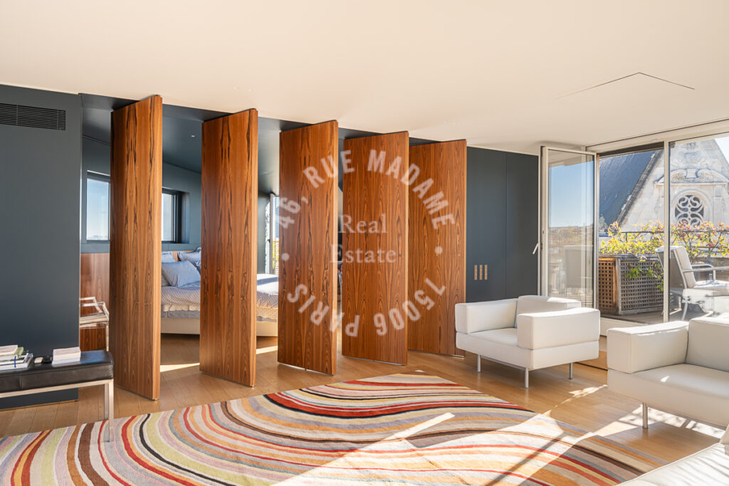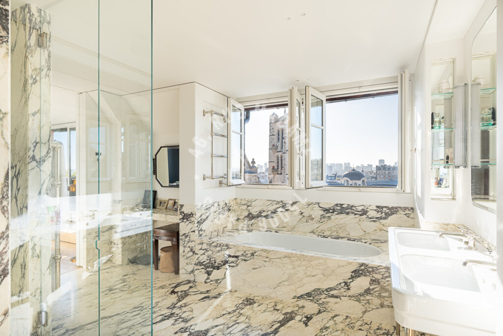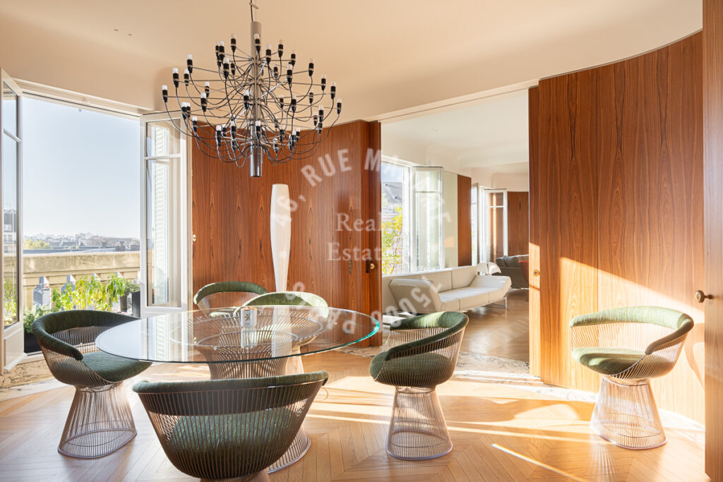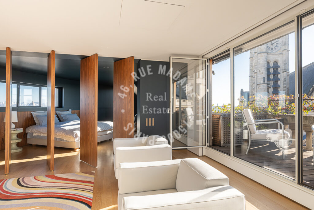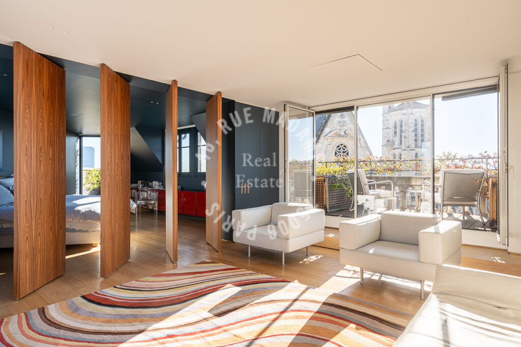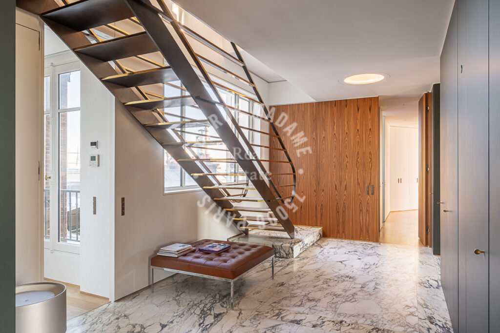 Aux derniers étages d’un bel immeuble pierre de taille, rare duplex traversant de 230m2 avec des vues exceptionnelles sur Paris et offrant des prestations de toute première qualité. Trois chambres, un grand espace bureau/home cinéma, aucun vis-à-vis. Deux terrasses de 7,40m2 et 4,80m2. Une cave.