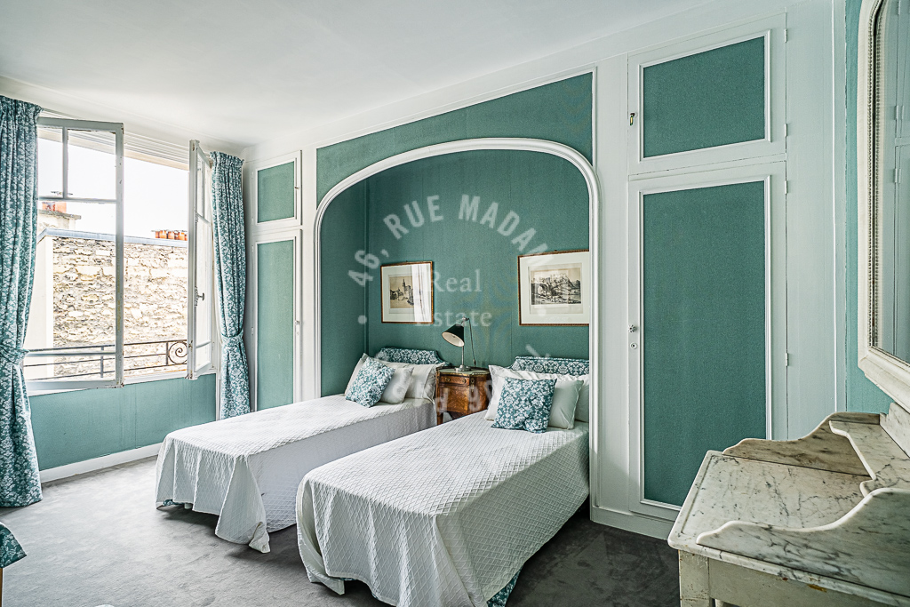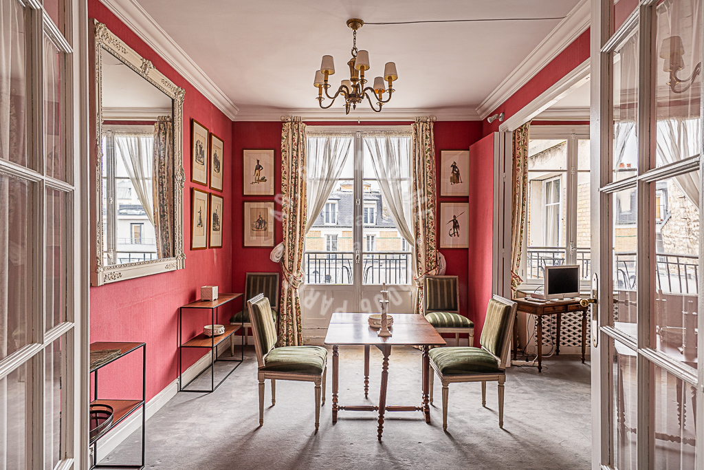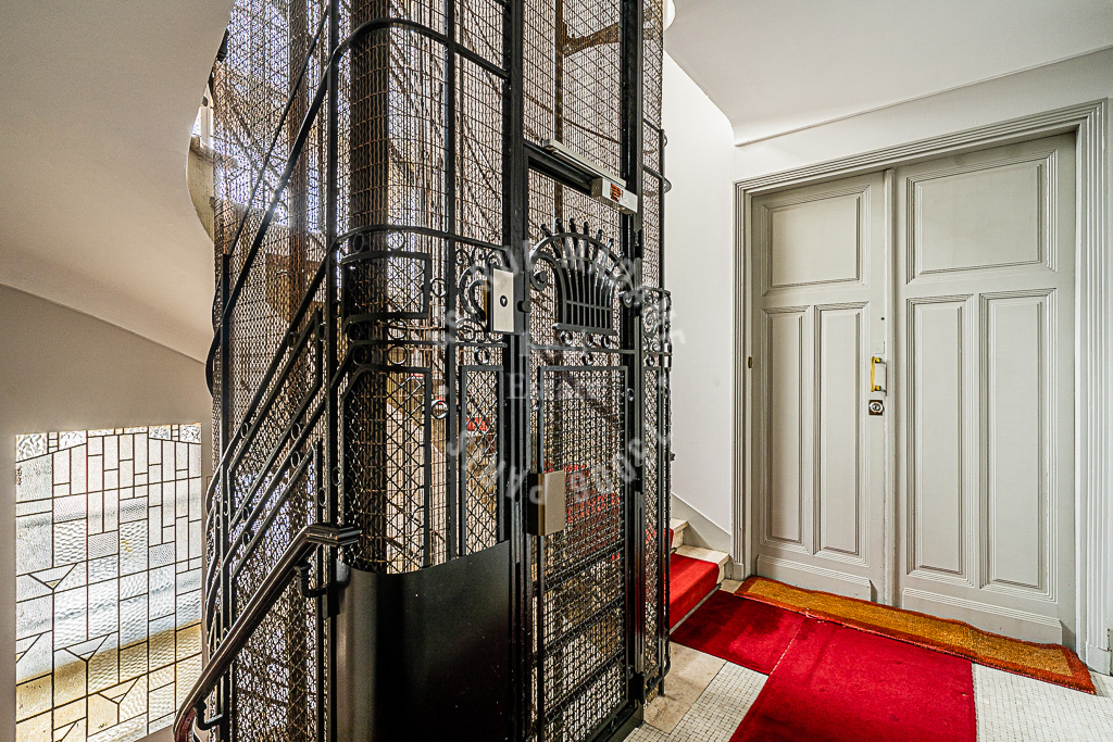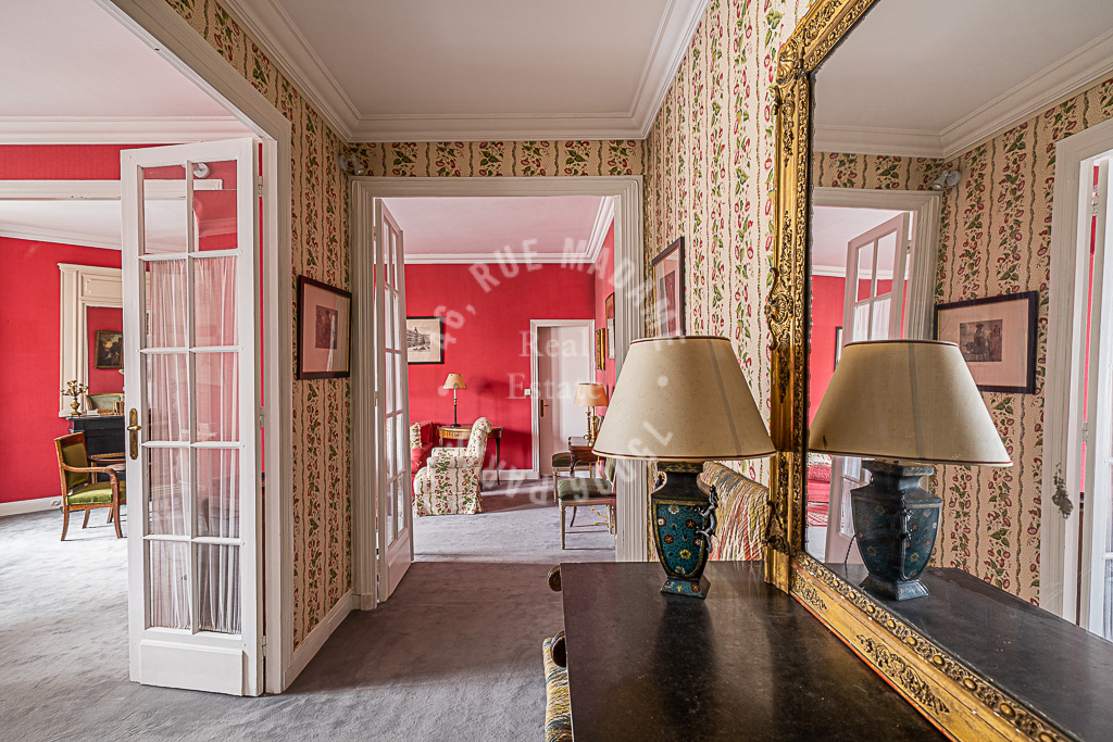 Entre le Trocadéro et la Place d’Iéna, en étage élevé, appartement de 102 m2 sur cour. A rafraichir. 2 chambres. Calme et lumière.