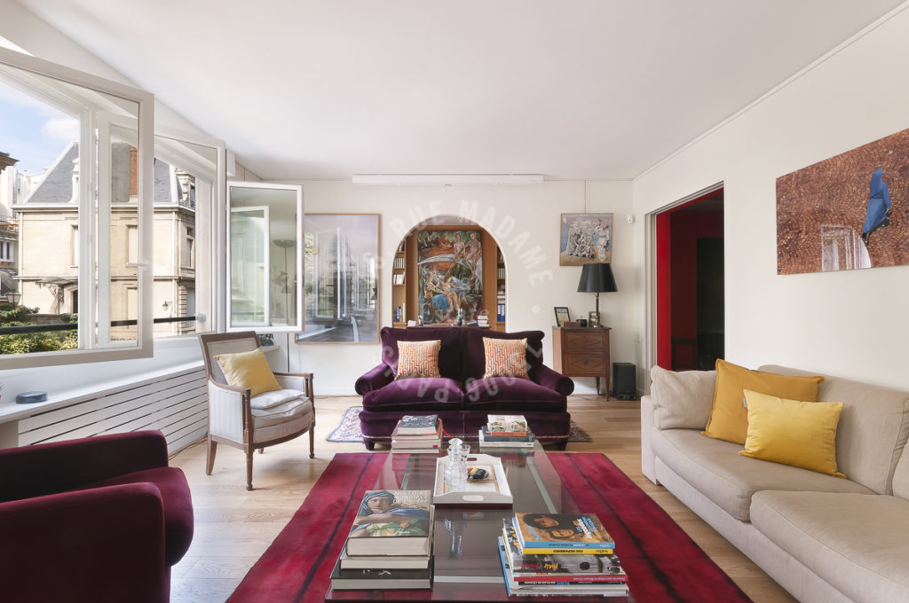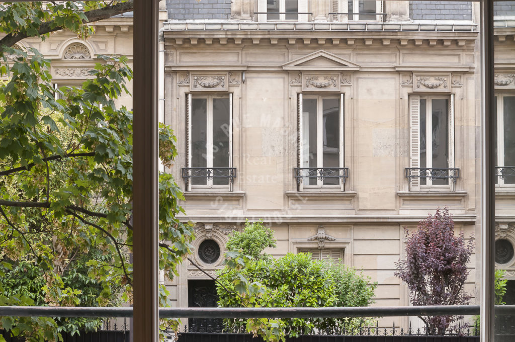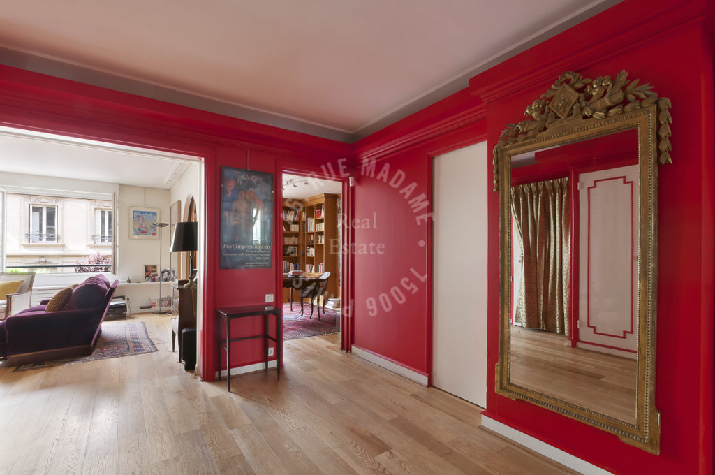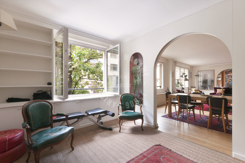 Dans une jolie rue au calme, agréable appartement de 153 m2. Exposition sud/ouest. Aucune perte de place et absence de vis à vis. Vues dégagées sur une vaste cour arborée et des hôtels particuliers. Plan modulable.