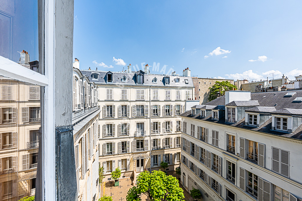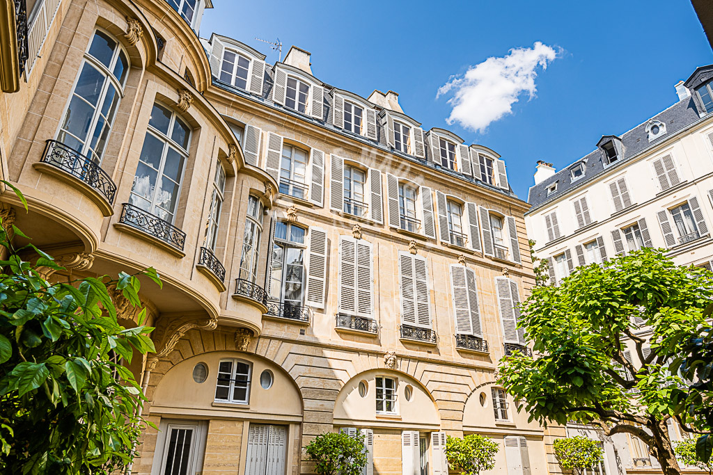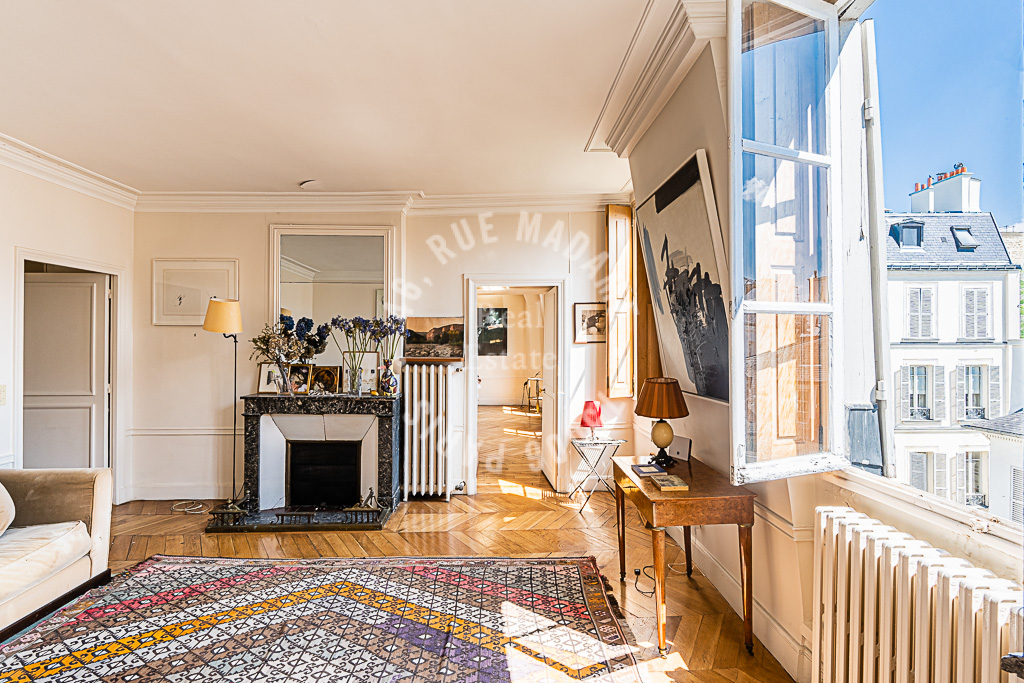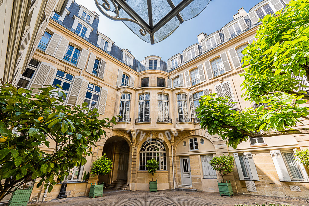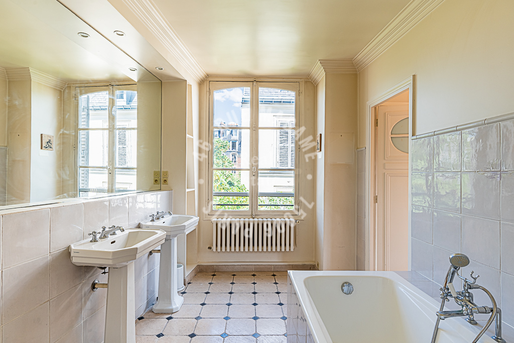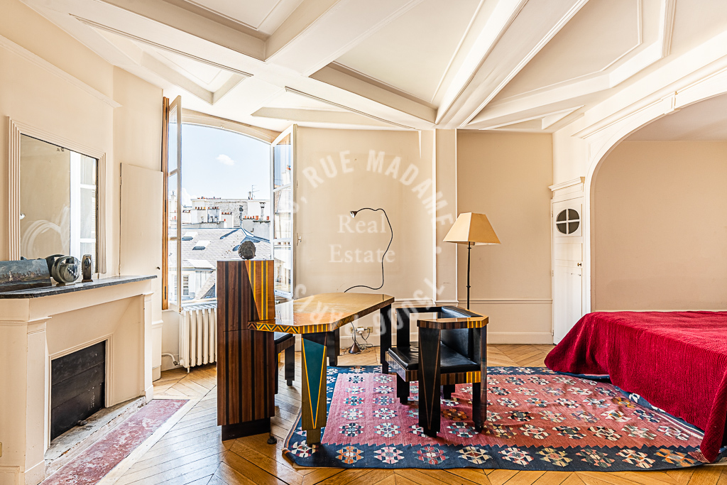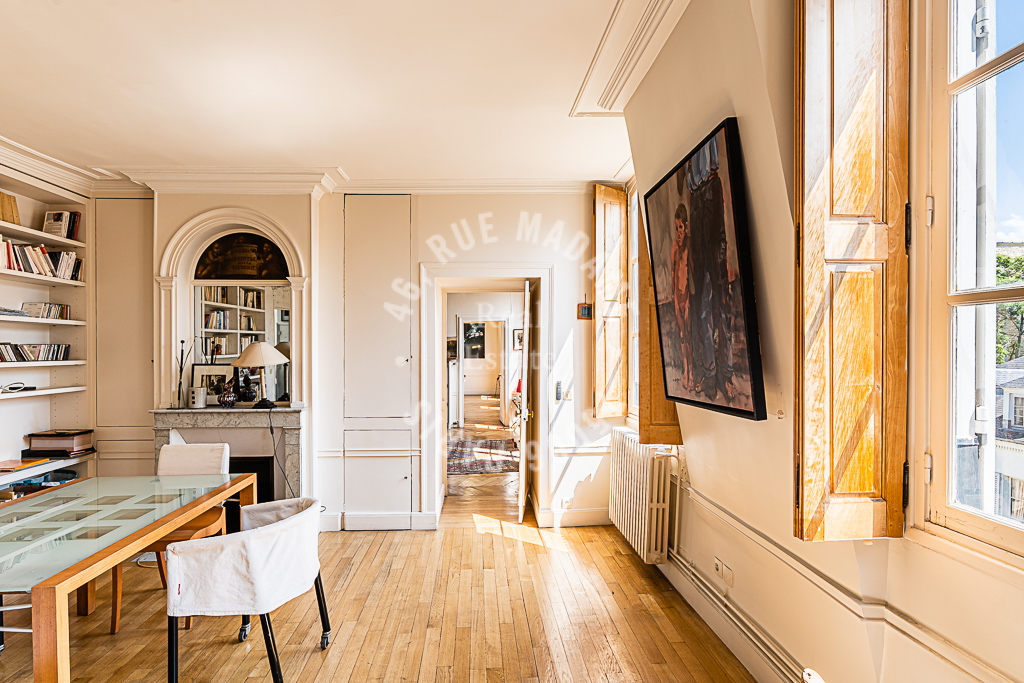 Au dernier étage d’un hôtel particulier aux parties communes remarquables, élégant appartement à rénover de 144 m2. Deux chambres. Calme absolu.