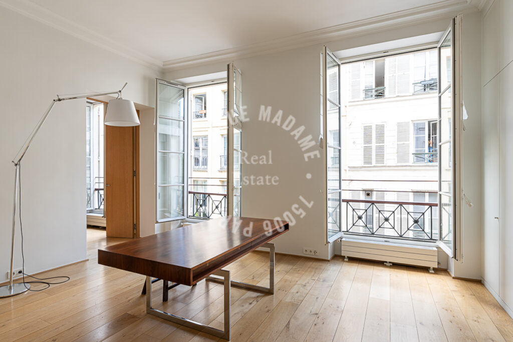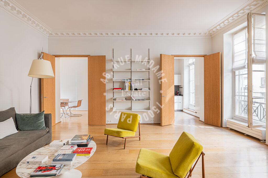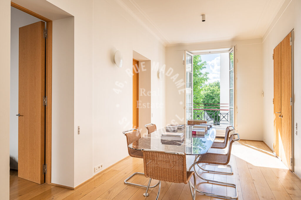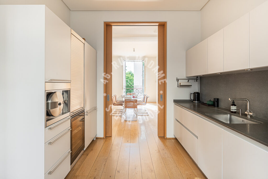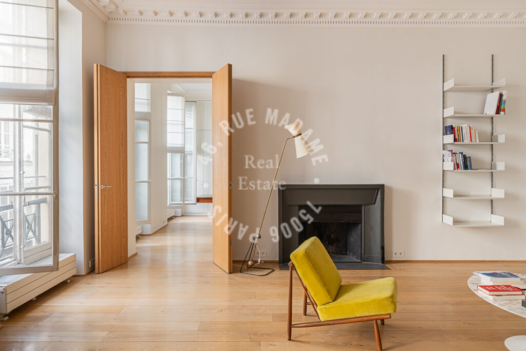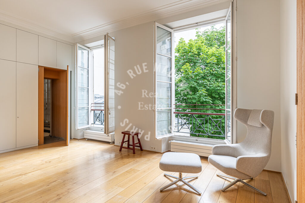 Exclusivité. A l’étage noble d’un bel immeuble XVIIIe, élégant appartement de 154 m2 traversant et en parfait état. 2 chambres et deux salles de bains. Beaux volumes. Vue dégagée sur jardin.